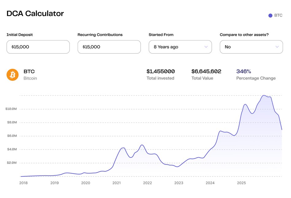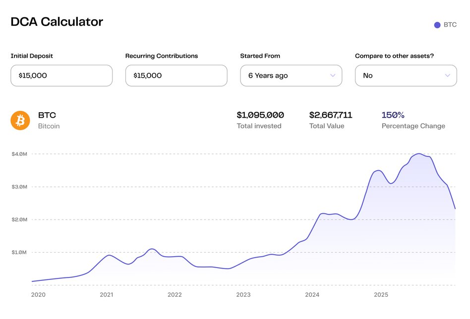 An investor who deployed just over a million dollars over six years through simple, consistent monthly purchases now holds a position worth approximately $2.7 million — even after Bitcoin has corrected nearly 46% from its October 2025 highs. That’s the power of a low average cost built through discipline.
