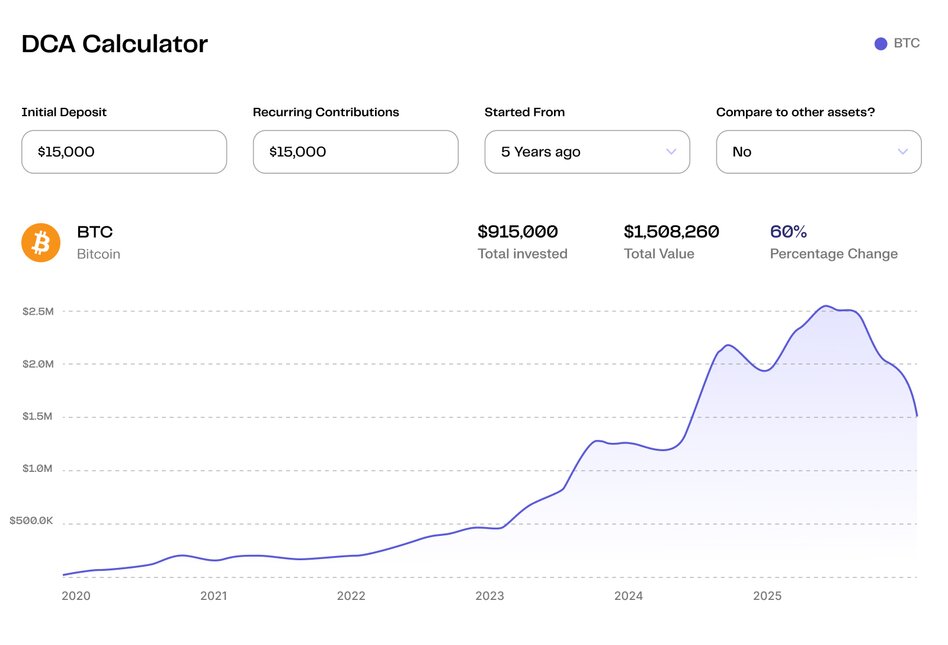Most lump-sum investors who bought near the peak in November 2021 would have been underwater for years. Many would have sold at a loss. But the DCA investor who kept buying through the drawdown? They accumulated significantly more Bitcoin at those lower prices, dramatically reducing their average cost.