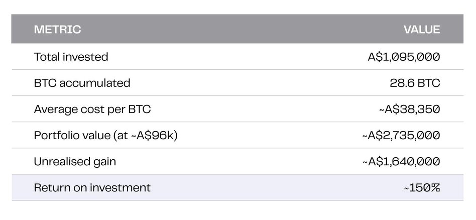 Note: All figures are in Australian dollars. Bitcoin prices have been converted to AUD using approximate prevailing exchange rates for each period. Current portfolio values are calculated at an approximate Bitcoin price of A$96,000 (mid-February 2026). Past performance is not indicative of future results.