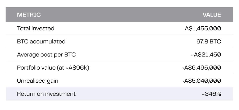 Under $1.5 million deployed over eight years has produced a portfolio worth approximately $6.5 million. The average cost per Bitcoin of roughly A$21,450 means this investor has substantial downside protection — Bitcoin would need to fall a further 78% from current levels before their position moved into loss.